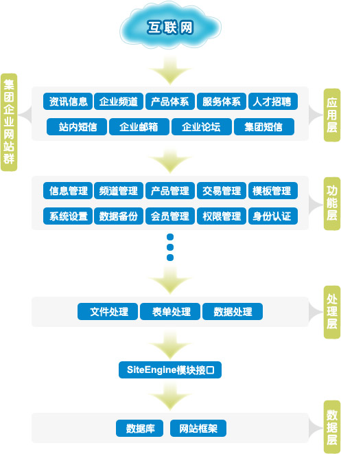 迅速实施集团企业网站建设及子公司网站群的构建,并能实现简易维护和按需扩展。在面向全球的互联网环境下,把公司各类优势资源整合到集团企业门户之下,根据集团企业行业特点,形成个性化的应用,并通过对信息和反馈的处理机制,促进集团企业内部形成有机统一。